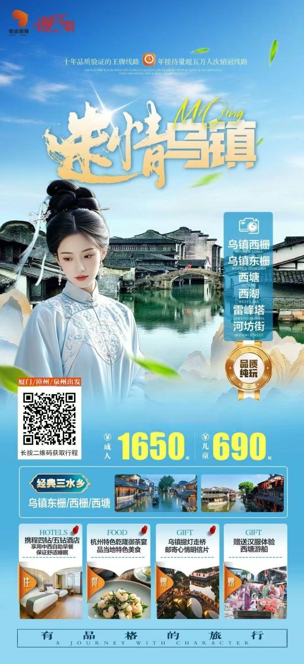 游览活着的千年古镇—【西塘】(赠送汉服体验,节假日除外)(游览2-3H)游览保存最完美的原生态水乡,这里是《谍中谍3》的拍摄地,游览烟雨长廊—江南水乡中独一无二的建筑。布局依水而缘,因水成街,家家临水,户户舟楫,小桥流水人家,一派水乡风光,可游览石皮弄,送子来凤桥,西园,烟雨长廊。倚坐与桥畔,江南水乡气息,小桥流水,大红灯笼,水上行舟,呼吸着饱含幸福的空气。车赴杭州(2.5H);