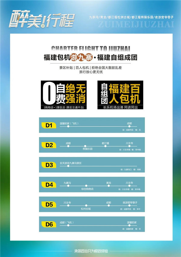 4、出行前请提前了解目的地天气地理状况,并请备好常用保暖,降暑,防晒,防雨用品及常备药品。请注意行程中上下车,行车中,酒店内,景区内,用餐点人身及财产安全;九寨黄龙均包含陡坡密林、悬崖蹊径、急流深洞等危险区域,请注意禁止标志,不可冒险前往;景区内禁止吸烟,请爱护公共环境卫生。