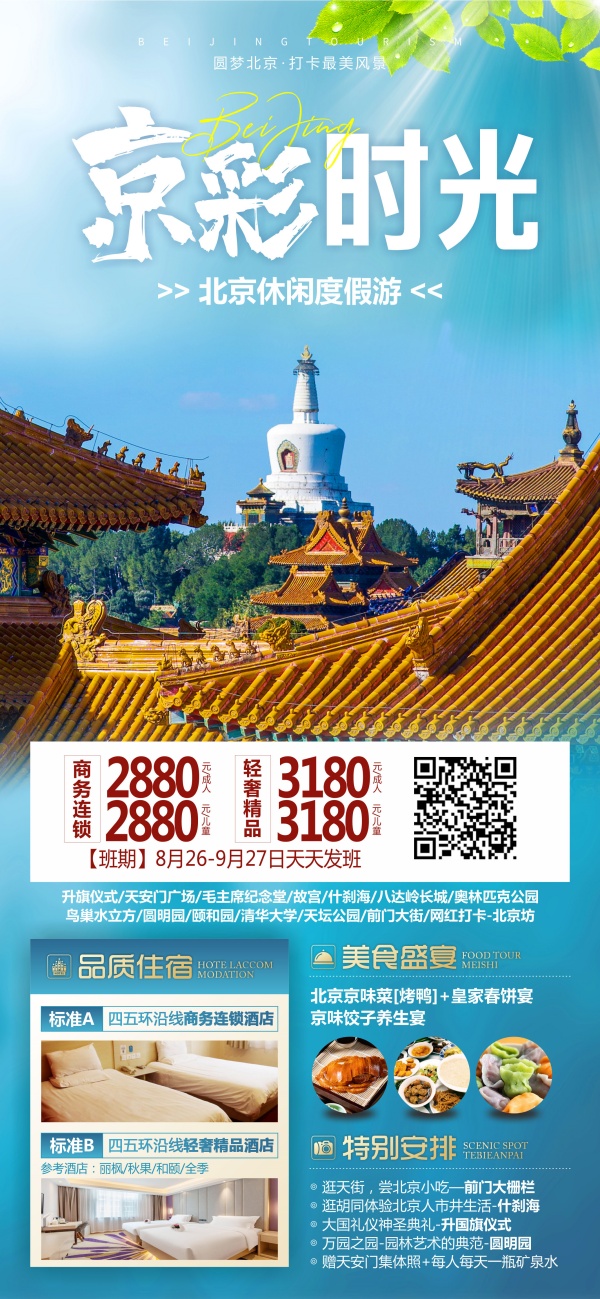 中餐安排特色【北京京味菜】特别安排品尝北京烤鸭体验老北京的美食;后参观【什刹海漫游胡同】(不少于40分钟。)什刹海指前海、后海、西海三个湖泊及邻近地区,这里拥有大片优美的湖面,也是北京著名的一片历史街区,众多名人故居,王府等古迹散落其中,还有贴近老百姓生活的各种美食,后海酒吧街更是京城夜生活的老牌胜地。游览明清两朝历代皇帝祭天之地【天坛公园】是世界文化遗产,明清两代二十四位帝王举行登基大典及祭祀天神的专用祭坛,也是世界上现存规模最大,最完美的古代祭天建筑群。(首道门票,不少于1小时),晚餐自理。后入住酒店休息;