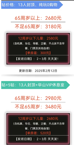 )华山索道(3选1 必须):北峰上下190元/人、西峰上下360元/人、西峰上北峰下280元/人。