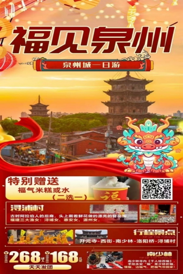 【07:00-07:50】厦门岛内各酒店免费上门接送【岛内市区各个酒店(因我们都是大巴车直接接送,有的酒店客人需走到离酒店最近的集合点上车,以工作人员通知为准);【08:00-09:00】穿越厦门翔安海底隧道、翔安区、泉州晋江,单程路程大概需要60分钟;泉州倡导文明旅游、无噪音旅游,需要游客租用无线耳机20元/人,自愿消费;【09:00】探秘【泉州南少林】,少林南拳文化武术起源地,游览时间60分钟;泉州少林寺,又名镇国东禅寺,俗称南少林,始建于唐朝,兴盛于两宋,至今已有上千年历史。经历几度兴废,史迹犹存。金庸大侠泉州之旅,为少林寺题下了:“少林武功,源远流长,传来南方,光大发扬”十六字,随后的金庸新版武侠小说里的南少林皆改为泉州南少林。