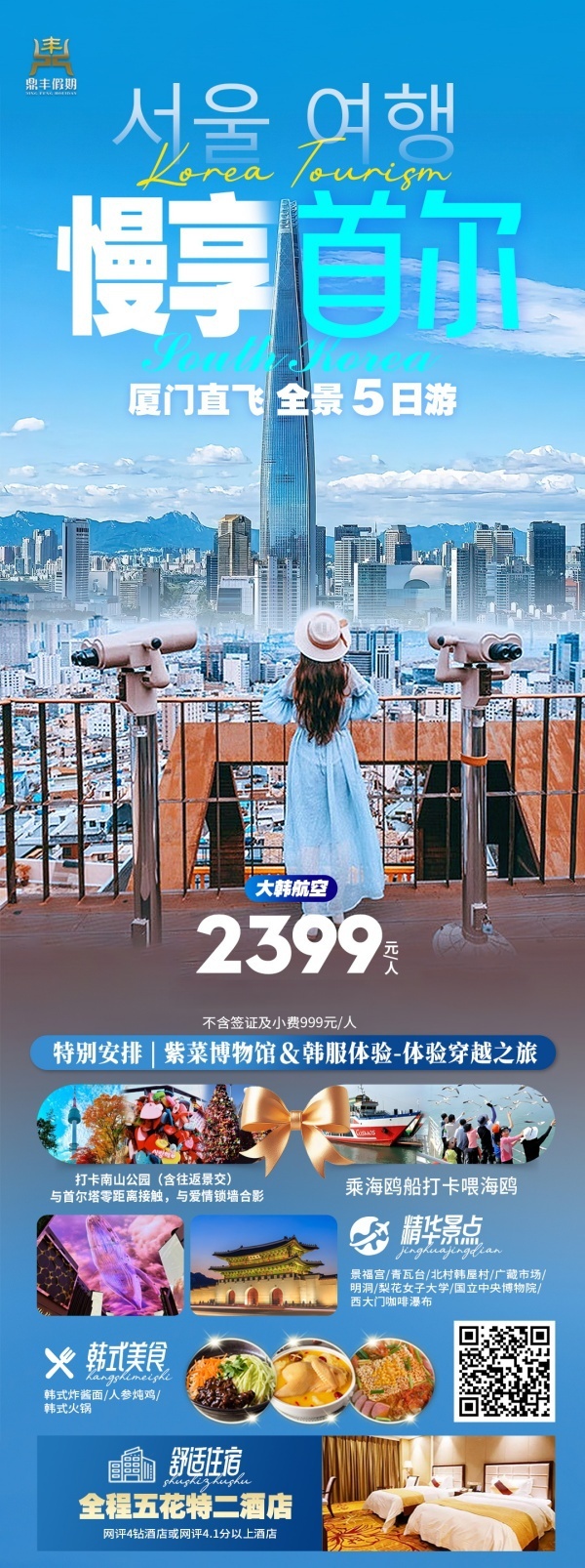 2)住宿:全程五花特二。(韩国无星级制度,网评4钻,或网评4.1分以上 )(以两人住宿一间标准房为基准,如旺季期间所安排酒店标间爆满,会自动提升全单间),如需一人住一房需补单间差(单间为标准单人房单间,而非标准双人房单人用)