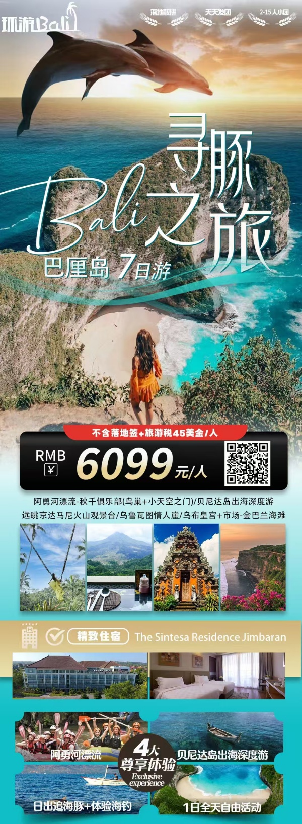 2-3 点 酒 店 出 发 , 【 日 出 追 海 豚 】 巴厘岛的北部,还有一处经常被遗忘的风景,他叫罗威纳 ,巴厘岛最低调宁静的海滩之一。罗威娜最大的特色就是伴着日出追海豚了,这一带海域生活着数百头海豚,每到黎明时分,成群结队的海豚就会出来觅食,在海面上形成壮观的“海豚军团”看海豚的最佳时间是日出后的一小时左右,船家会开着当地特色的“螃蟹船”,载你去海豚经常出没的海域,邂逅海上精灵。从若隐若现的几只开始,到成群结队的跃出海面 ,每一次都能引起海面上的阵阵惊呼最棒的还有壮阔绚丽的海上日出可看,黎明的晨光一点点染红犹如镜面的海域,灰蒙蒙的天空被朝霞缓缓点亮,没准正在你望向太阳时,恰好海豚出现在你的视野,它们在海上跳跃旋转,这一刻,你会觉得所有早起的辛苦都是值得的。(PS:追海豚乘船时间较长,可提前服用晕车;早晨海上气温较低,记得带件薄外套)独家安排:体验海钓,不 管你 会 不会 钓 鱼 ,都 可 以体 验 下钓 鱼 佬的 快 乐 哟~潇 洒甩 杆 ,等 待 海 上“ 抓 娃娃 ”的乐趣吧。钓上来的鱼都可以带走或就地加工食用。远观【 京 达 马 尼 火 山 】 京达 马尼 位于 巴厘中 部北 边山区 ,这 里是 印尼少 有的 清凉地 区, 景区设 有观 景台,巴杜尔湖和巴杜尔火山占据了京打马尼一半的领地。山上或覆盖着茂密的热带雨林,或种着绿油油水稻的梯田,巴杜尔火山是一座活火山,1917 年曾经喷发过,摧毁了无数神社、村庄。但是也同样带来了富含矿物质的土壤,火山周围一带栽种着柑桔、香蕉、咖啡、椰子等作物。火山还挡住了从印度洋来的富含水气的云,在此形成丰沛的降雨。【 Finns Beach Club】 在巴厘岛水明漾附近,这里是全球最大 海滩酒吧之一,拥有超大的场地和多样的座位区域,包括沙滩 、海边、泳池等。音乐氛围浓厚,DJ 播放的曲风偏电音,适合喜欢热闹氛围和电音音乐的游客。舞池里大家在尽情蹦迪,气氛非常嗨。卡座设有最低消费限制。