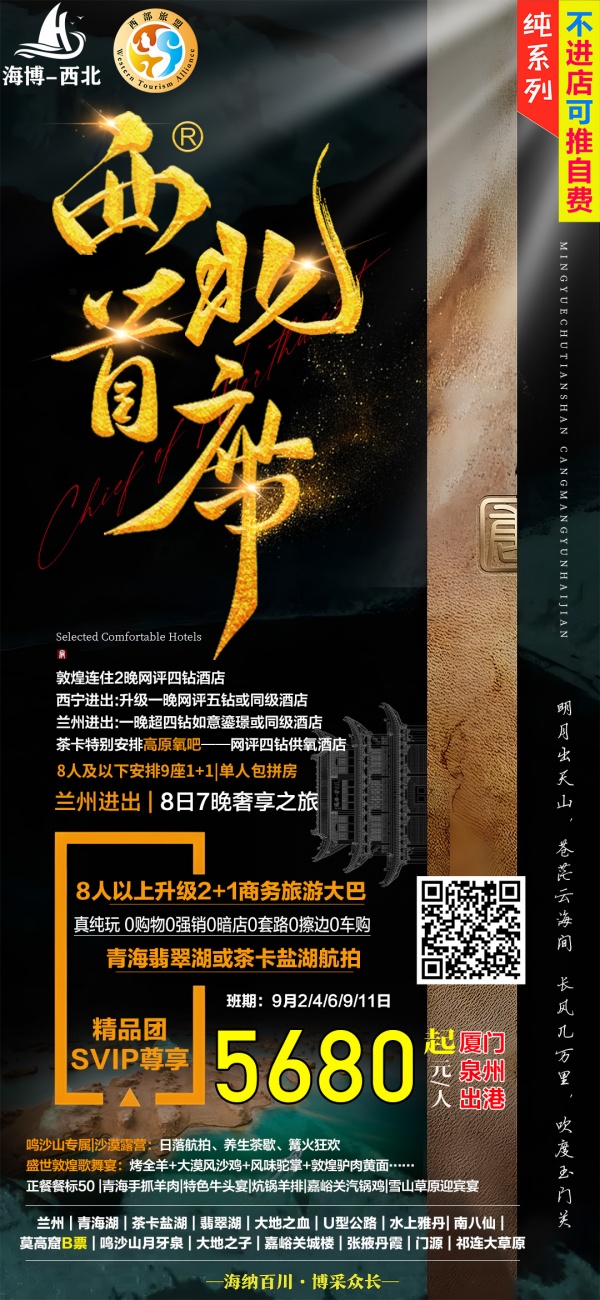 今天您将化身为--西海浪漫的歌手在那遥远的地方,有人吟唱着西海情歌,为伊千千万万遍;有人背靠青山面朝大海,等待下一个春暖花开。湖畔的日落时分,马头琴一曲奏出,谁又会雅兴大发在此高歌一曲呢?您今天将会去哪里-07:30 酒店出发,乘车前往青海湖,途经西宁(兰州进出港的客人,如遇当天同批团期有西宁进出港的团友需从兰州出发前往西宁接上团友后正常开始走行程,如带来不便之处,敬请谅解),途经“海藏咽喉【湟源峡谷】,翻越【日月山】,途经【倒淌河】12:30 抵达餐厅,享用中餐14:00【青海湖二郎剑】(含大门票,游览约2H),中国内陆第一大咸水湖,素有高原明珠之称,微风吹过在湖面卷起涟漪,眼前的湖泊,远处的雪山,我只能放慢脚步,才能把美色留住。16:30 乘车前往茶卡镇19:00 安排晚餐