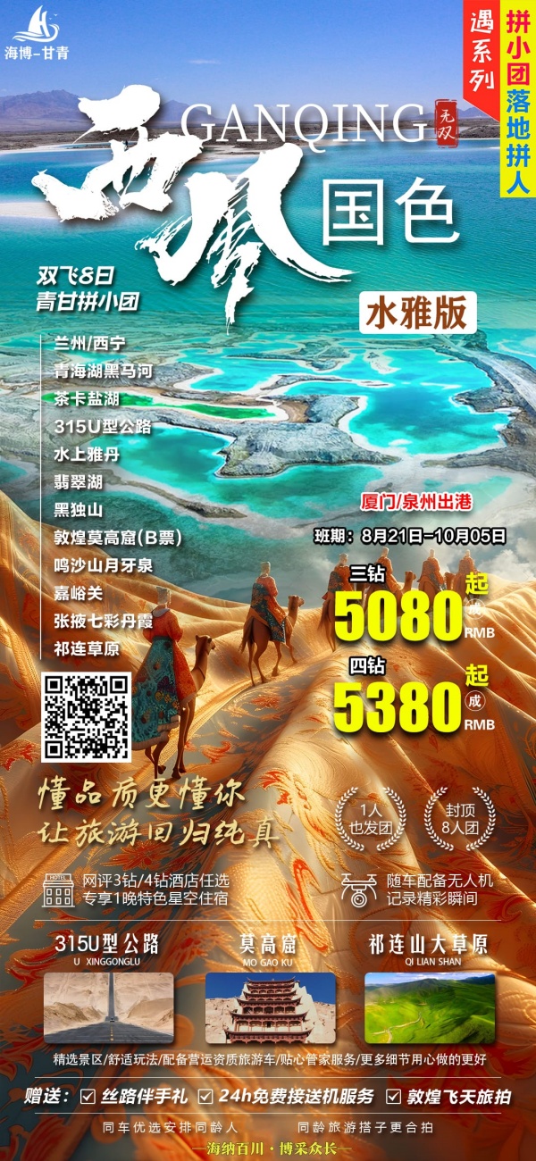3.门票:青海湖黑马河0元/人、茶卡盐湖 60 元/人(天空之镜/天空壹号)、水上雅丹 60 元/人、翡翠湖 50 元/人、黑独山 30 元/人、鸣沙山月牙泉 110元/人、莫高窟B票100 元/人(如未能出B 票,补 138 元/人改为 A 票)、七彩丹霞 55 元/人=465 元/人等首道大门门票。