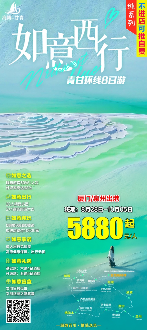 1、门票安排:张掖七彩丹霞、莫高窟B类票、鸣沙山月牙泉、大柴旦翡翠湖、察尔汗盐湖、茶卡盐湖-天空壹号景区、青海湖二郎剑景区(含景区首道大门票,产生其他费用敬请自理)赠送项目:茶卡盐湖天空壹号无人机航拍视频(赠送项目不用不退);
